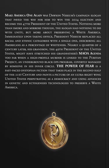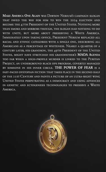 Make America One Again was Dawson Nerium’s campaign slogan which paved the way for him to win the 2024 election and become the 47th President of the United States. Nothing more than smoke and mirrors though, the slogan had nothing to do with unity but more about preserving a White America. As part of his MAOA agenda, President Dawson Nerium replaced race as a category with a percentage of whiteness immediately upon taking office. Nearly a quarter of a century later, his grandson, the 49th President of the United States, stretched his grandfather’s agenda too far when a murder is linked to the Puritan Project, a covert government black ops program managed by someone in his inner circle. THE POWER OF FEAR is a fast-paced fiction that takes place in the second half of the 21st Century, a dystopian future of an ultra-right wing United States perpetrating as a democracy using advances in genetic and ectogenesis technologies to preserve a White America.